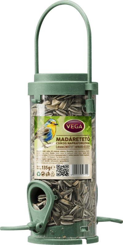 Újrahasznosított anyagból készült madáretető csíkos napraforgóval.