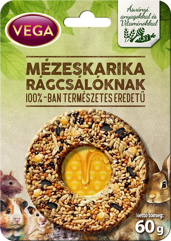 A Vega Mézeskarika a rágcsálók által legszívesebben fogyasztott magvakból lett összeválogatva és ízletes virágmézzel összeragasztva. Összetevői 100%-ban természetes anyagok. Rágcsálása kellemes testmozgást és jó közérzetet biztosít kedvenceinknek, miközben értékes tápanyagokhoz, vitaminokhoz juttatja szervezetüket.