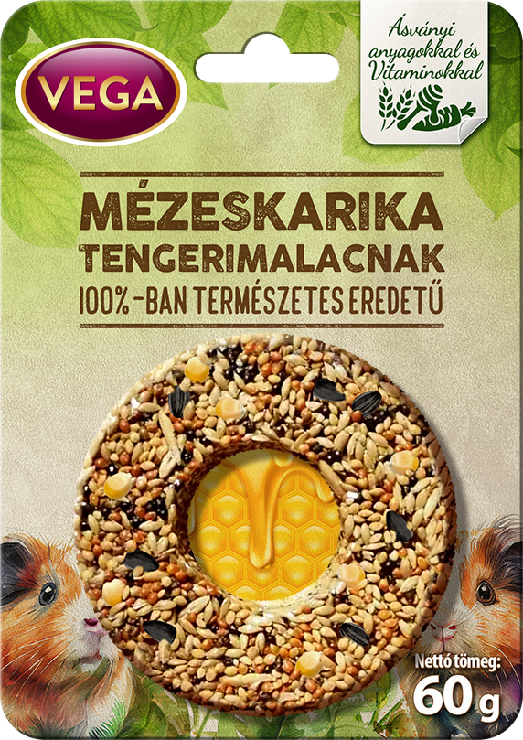 A Vega Mézeskarika a tengerimalacok által legszívesebben fogyasztott magvakból lett összeválogatva és ízletes virágmézzel összeragasztva. Összetevői 100%-ban természetes anyagok. Rágcsálása kellemes testmozgást és jó közérzetet biztosít kedvenceinknek, miközben értékes tápanyagokhoz, vitaminokhoz juttatja szervezetüket.